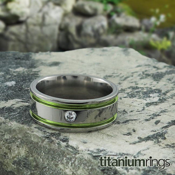 The Abyss with a single 3mm gem is a double grooved Titanium wedding band that appeals to both men and women.