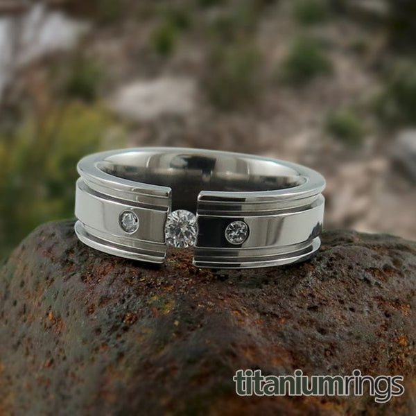 The Abyss Tension Titanium ring with side stones is a squared, double grooved, cult classic band. The band securely hugs a 3mm gem and has two 2mm gems on either side of the tension setting, making it a symbolic past-present-future design. This is an excellent wedding band for men or women who have an active lifestyle or require a more rugged style. To further customize your ring, we offer a broad selection of affordable, natural gemstones including Diamonds.